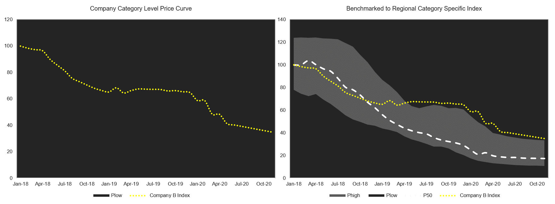 The example below demonstrates why the “blind” approach to supply chain strategy doesn’t work. When you only look at Company B’s price curve over two years (left), a price drop of 60% looks favorable. But data shows that the aggregated market price index dropped by 80% during this same period. The comparison of Company B’s prices with the market (right) demonstrates that there is room for additional cost savings, as it is still overspending compared to the market.