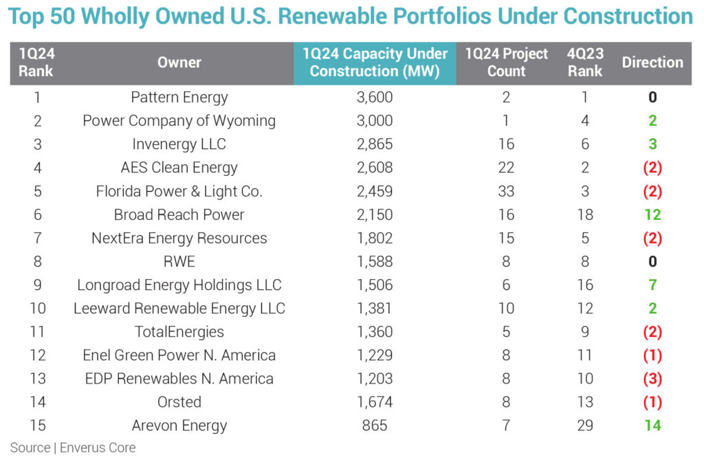 U.S. renewables developers Arevon Energy, Longroad Energy Holdings and Broad Reach Power showed the most improvement among the top 20 wholly owned renewable energy portfolios under construction in Q1, according to an analysis using Enverus Core data presented in the most recent issue of Energy Transition Pulse. All three companies roughly cut their ranks in half on the top 50 leaderboard, with more than 2 GW of combined project additions breaking ground.