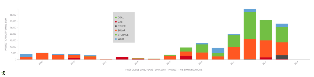 From 2016-2021, there was a rapid and consistent year-over-year uptick in power generation capacity added to the APS Interconnection Queue, comprising almost exclusively renewables and storage projects. Queue activity has cooled slightly since that peak in 2021 but is still consistently far higher than it was before. And as discussed in the previous section, far higher than most of the rest of the country.