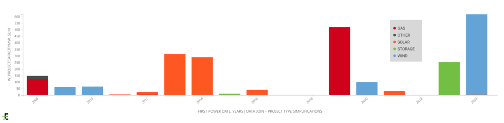 That trend is in line with the most recent APS Integrated Resource Plan, which indicates a commitment to shifting the energy mix away from fossil fuels like coal and towards renewables and storage over the next 15 years. And they are already beginning to deliver on that promise. In 2024 alone the Babbitt Ranch Wind and Chevelon Butte 1 & 2 Wind projects were all brought online, totaling 615 MW of capacity. This followed a productive year for storage projects in 2023, when 251 MW of storage capacity (spread across nine projects) were brought online. The specific project types are different than the IRP projected; it called for more solar thus far and less wind. However, the total renewables plus storage projection for the years 2023 and 2024 was 795 MW, which has been outpaced thus far by the 866 MW built.