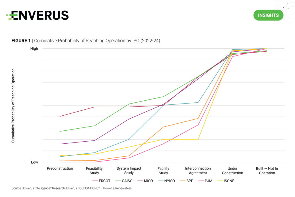 Interconnection queue durations across independent system operators (ISOs) have lengthened and the proportion of projects successfully reaching completion is shrinking. To explore this in detail, Enverus Intelligence® Research captures the average duration of each phase in a project’s lifecycle, the delays encountered at each stage and suspension trends across the project lifecycle.