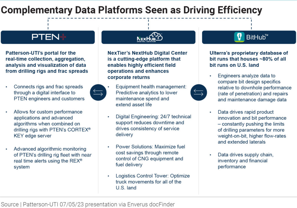 While Patterson-UTI was already dabbling in fracking, NexTier brings another 33 fleets, leading to a combined capacity of 45 fleets and 3.3 million hhp, behind only Halliburton in the U.S. on both figures. While NexTier owns no drilling rigs, Patterson-UTI’s current fleet of 172 super-spec drilling rigs in the U.S. trails only Helmerich & Payne. Nearly two-thirds of the combined company’s frac fleets are dual-fuel capable, and 120 of the drilling rigs are Tier 1. In addition, NexTier brings a last-mile logistics platform for frac sand and Ulterra comes with BitHub, its proprietary database with information on 80% of all bit runs on U.S. land.
