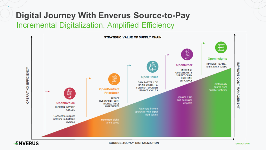 Enverus’ supply chain solution for suppliers supports the end-to-end order placement, receipt, invoicing and the fulfilment process. Leveraging a network of more than 40,000 active vendors, companies can completely digitalize a process that is typically manually intensive and unintegrated. Oilfield service companies can generate purchase orders or service orders that are supported by negotiated pricing, validate them against goods receipts or work tickets, then automatically approve invoices knowing that scope, quantity and pricing have all been digitally validated.