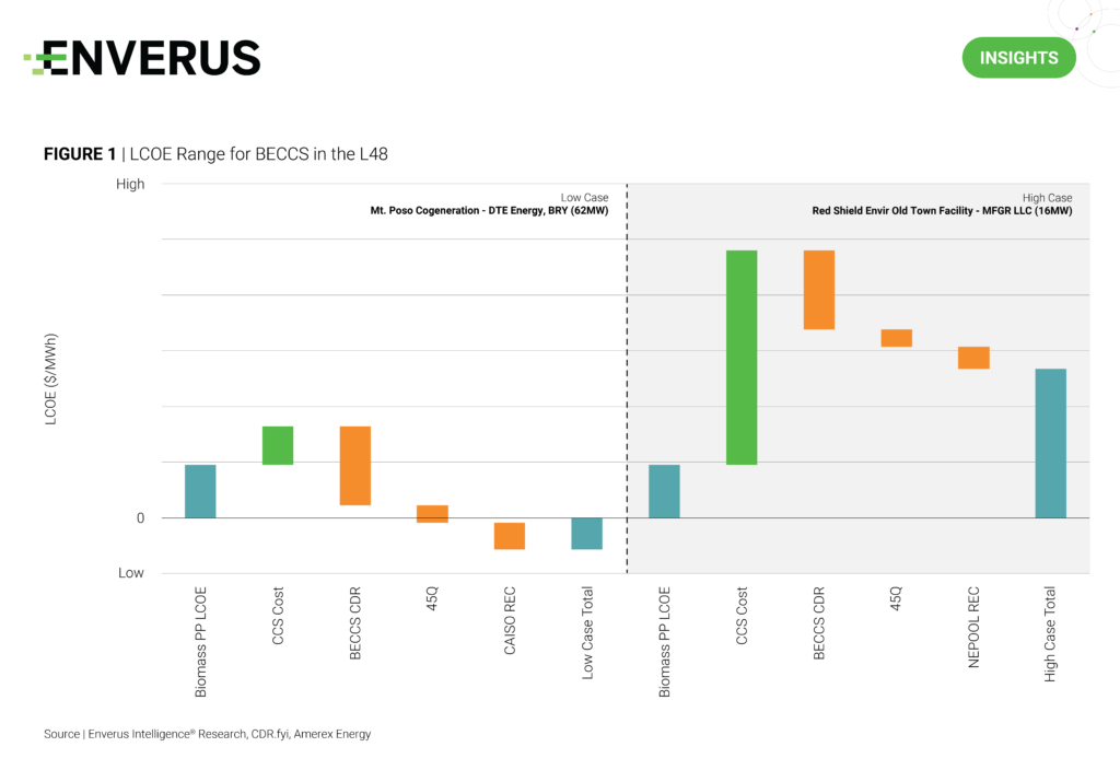 Biomass energy with carbon capture and storage (BECCS) is emerging as a leading pathway for CCUS commercialization. With the ability to stack incentives such as the $85/tonne 45Q tax credit, renewable energy credits (RECs) ranging from $2.08/MWh in the national voluntary market to $48.50/MWh in CAISO, and the $387/tonne carbon dioxide removal (CDR) credit, BECCS can achieve negative levelized costs of electricity (LCOE). At the lower end, LCOEs can reach as low as -$57.82/MWh, driven by high CO₂ capture volumes that benefit from economies of scale, proximity to sequestration sites, and access to premium REC markets depending on the ISO. In contrast, smaller-capacity facilities situated farther from Class VI injection wells can see LCOEs rise substantially, up to ~$267/MWh. This cost disparity indicates the importance of location and scale when considering BECCS opportunities.
