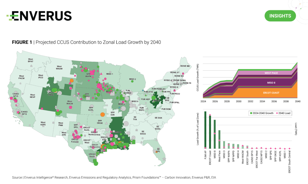 When examining future demand, Enverus Intelligence Research finds that although CCUS accounts for only 0.5% of load growth out to 2040 – approximately 26 TWh – the distribution of these projects is uneven across regions (Figure 1). Enverus Intelligence® Research predicts that CCUS will account for over 10% of zonal level load growth in PJM AP, ERCOT Coast, MISO 8 and West Pace (home of Project Bison).