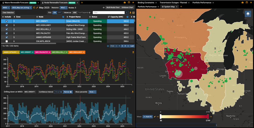 We show MISO wind generation forecast for May 2025. In the top panels we select the wind nodes of interest. Selected nodes are populated in the time series, showing mean generation at each node from 2017 – Aug 2025. We select MEC.ORIENT1 node for further analysis, including hourly percentiles in the bottom time series. The right map shows MISO zonal generation forecasts and the green dots show wind generation nodes.