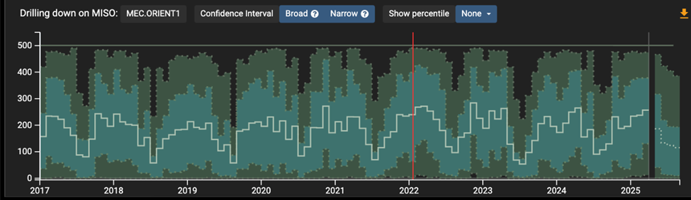 We select a MEC.ORIENT1 in the drill down feature. The time series shows monthly generation for historical and forecast values. The solid line is mean generation, the narrow band is hourly p25-p75 values, and the broad band is p5-p95 values. Hourly generation values are available via API.