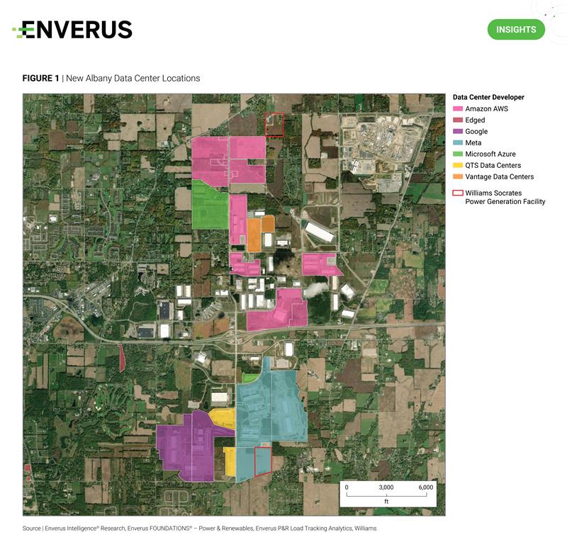 Where are data centers getting built? Who owns land locked up and where? These are common questions we are getting from clients. Case in point: Williams’ recent development in New Albany, Ohio, grabbed headlines, potentially powering a massive behind-the-meter gas-fired power project, operating without CCUS, under a 10-year power purchase agreement. Using Enverus Intelligence® Research’s (EIR) proprietary parcel and load tracking analytics, we previously identified land purchases by a likely partner involved in the Williams project (Figure 1).