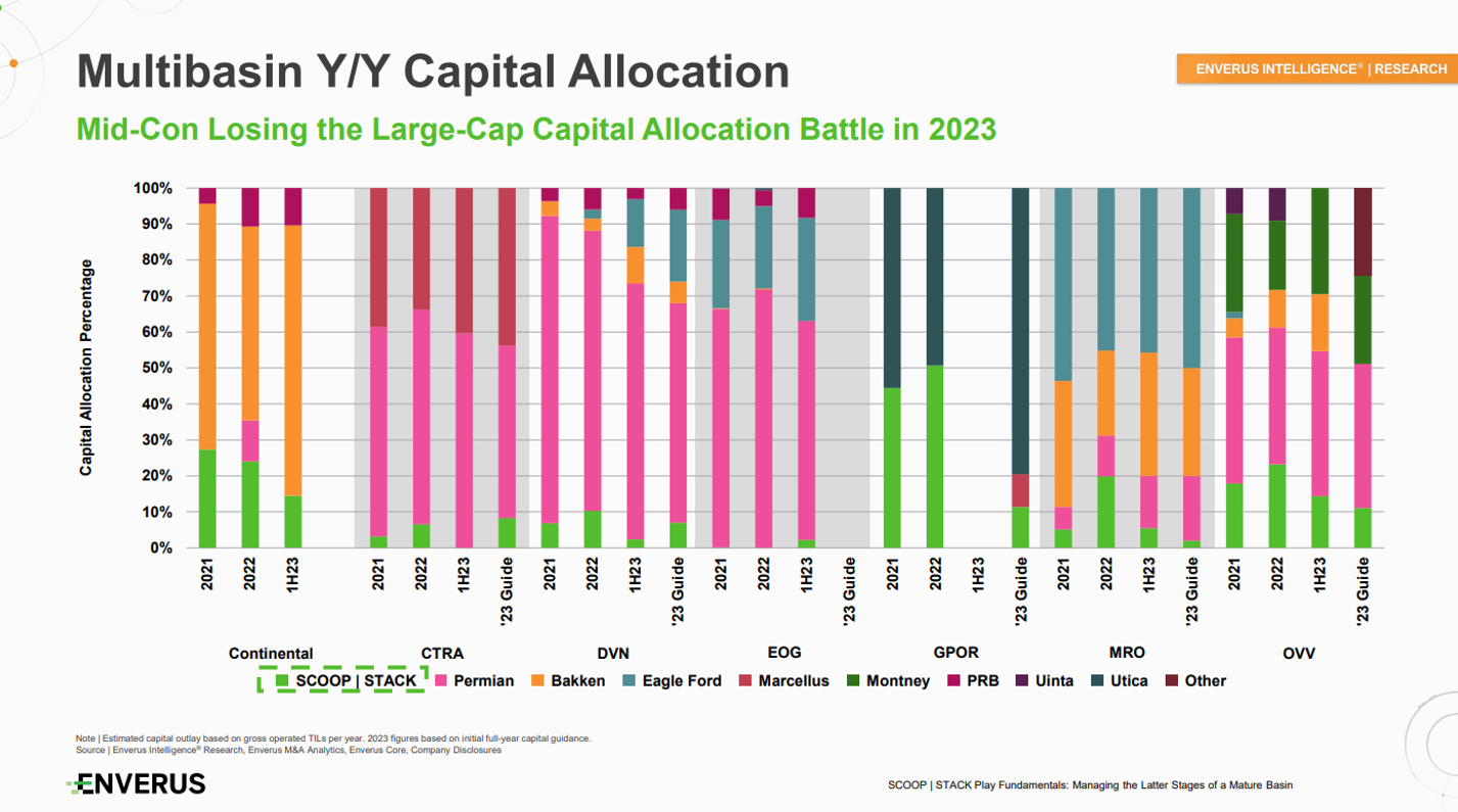 Improving the economics and potentially extending the life of maturing basins are refracs, introduction of enhanced oil recovery and drilling of 3-mile laterals. But given its history and complete lack of interest from major operators to drill (as summarized below), the Midcontinent’s heyday is at an end. The private E&Ps that are holding on to acreage in Oklahoma’s SCOOP, STACK and SWISH are primarily focused on squeezing efficiency out of operated wells not drilling. And the remaining natural gas potential that exists will have to compete with Haynesville, Eagle Ford and even Permian associated gas as the economics improve with LNG facility buildout.