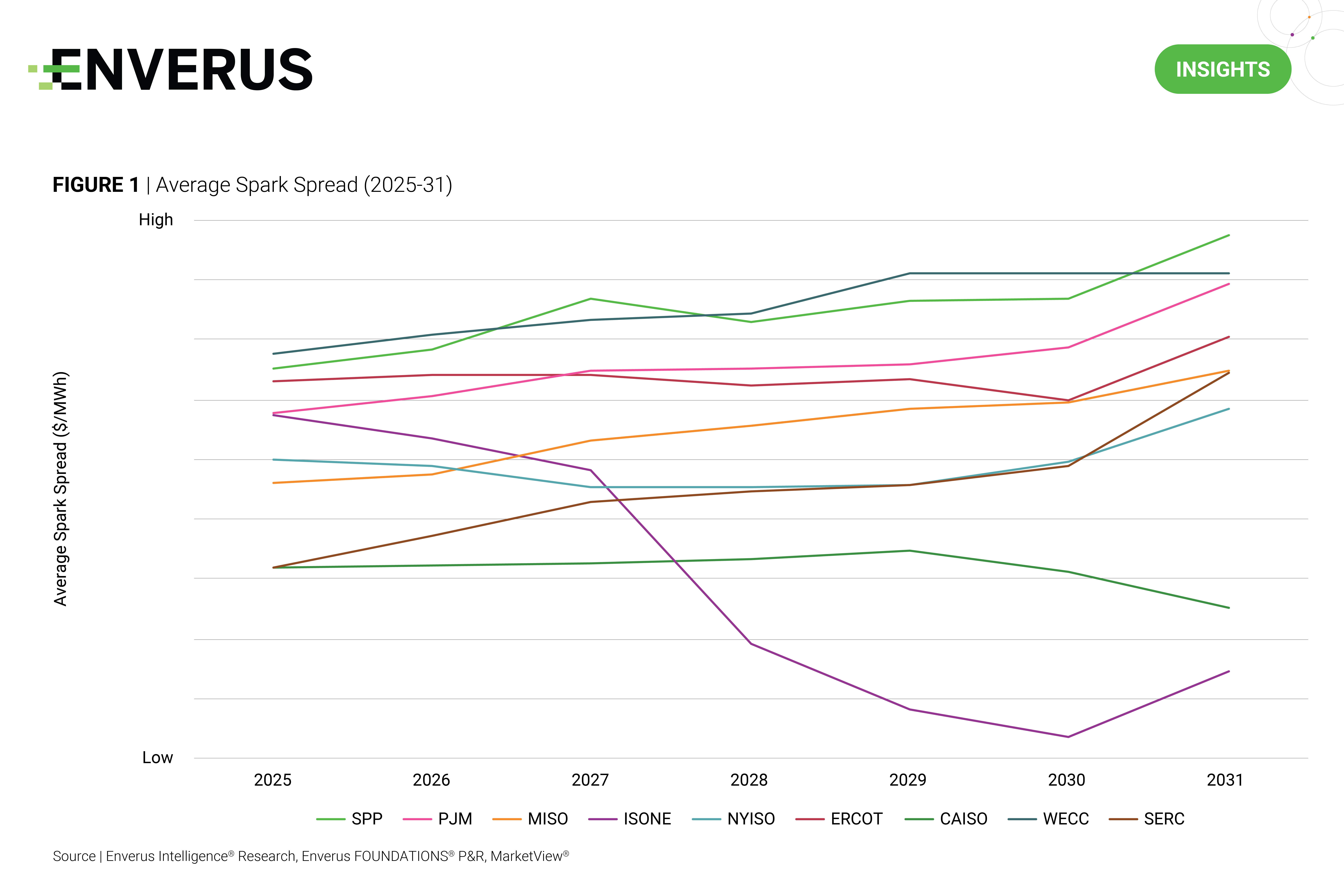 As part of the market screening analysis, EIR uses spark spreads—a measure of the difference between electricity market prices and the cost of natural gas in generation—as a key indicator of profitability for natural gas plants across ISOs. Spark spreads reflect the gross margin between fuel costs and electricity revenue. The market-implied spark spreads through 2031 shows the lowest average spark spreads in ISONE and CAISO, at $15/MWh and $16/MWh, respectively, while SPP and WECC record the highest, at $37-$38/MWh. These insights help evaluate market profitability and guide natural gas investment decisions across regions.