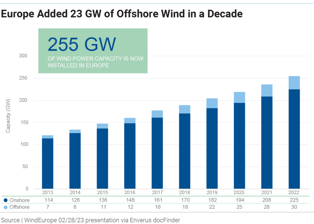 Since then, only one project has been fully completed—Ørsted’s 132 MW South Fork Wind in March—while Avangrid’s 806 MW Vineyard Wind has delivered first power and will be completed later this year. While not a true apples-to-apples comparison, Europe installed 1.5-3.7 GW of offshore capacity per year between 2013 and the end of 2022, growing from a total of 7 GW to 30 GW over that time frame, according to industry association WindEurope.