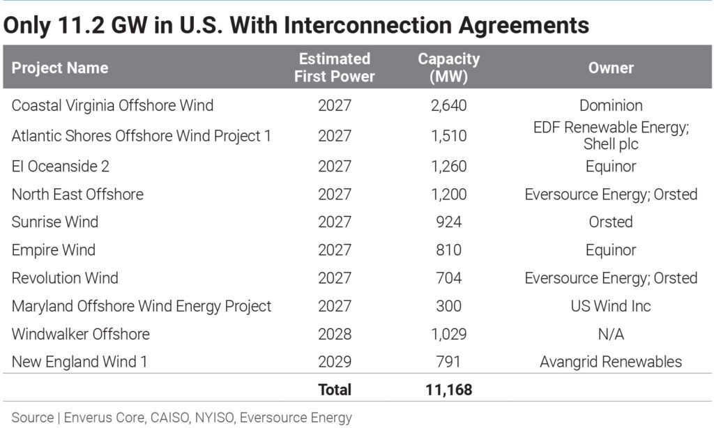 According to Enverus Core data, there is roughly 41.1 GW of offshore wind capacity in the U.S. with assigned project names and/or developers that could potentially come online before YE30. (Enverus Core users, click here to interact with the workbook.) Only around 11.2 GW of those projects, however, are advanced enough to have interconnection agreements in place. The remaining roughly 30 GW of capacity is still in earlier phases of development with significantly less visibility regarding the likelihood of completion. Even for those projects with interconnection agreements, several developers have been struggling to make them commercially viable.