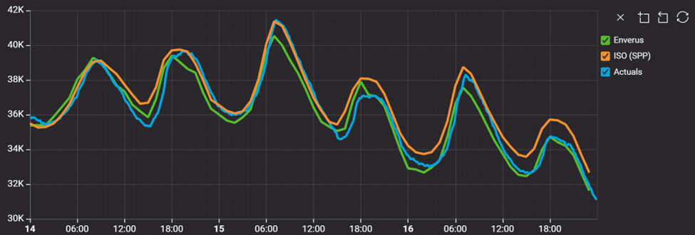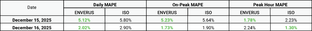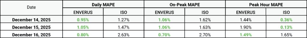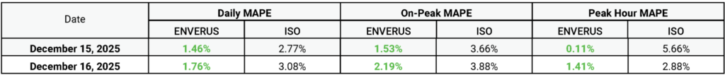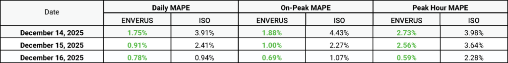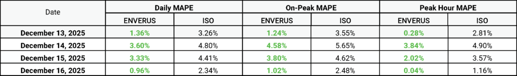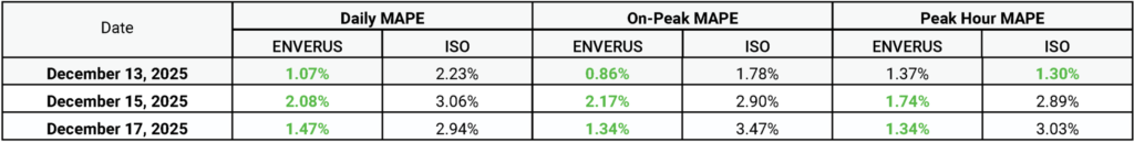 Notably, on Friday, Dec. 12, Enverus’ load forecast projected a Monday peak of roughly 133 GW—outpacing the ISO’s 126‑GW estimate and demonstrating more accurate peak‑load prediction three days in advance.