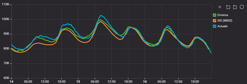 Enverus consistently produced lower MAPE than MISO throughout the cold snap, even during the most volatile periods.