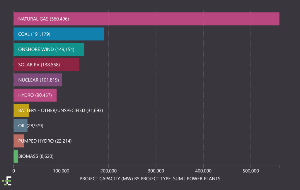 Figure 1: Total operating capacity in MWs by project type across the U.S. based on power plants data from Enverus PRISM®