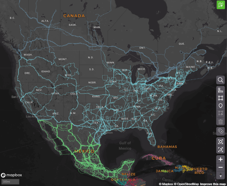 Figure 10: Fiber optic lines across the U.S., Canada, in Mexico represented in the PRISM mapping tool