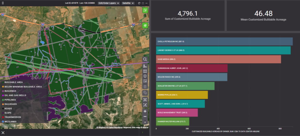 Figure 12: The left-side map shows an output from the Customizable Buildable Acreage (CBA) model in PRISM where custom inputs were defined of what is buildable to visualize what areas are buildable and are not around an ideal substation for data center development in Texas. Top right metrics show the total buildable acreage and mean of buildable acreage across the given area on the left based on user-defined buildability inputs. The bottom-right row chart shows total buildable acreage by parcel owner in the given area of interest. The CBA model lives within the Suitable Land Analytics add-on in PRISM and is key to helping users decipher land suitability for large load projects.