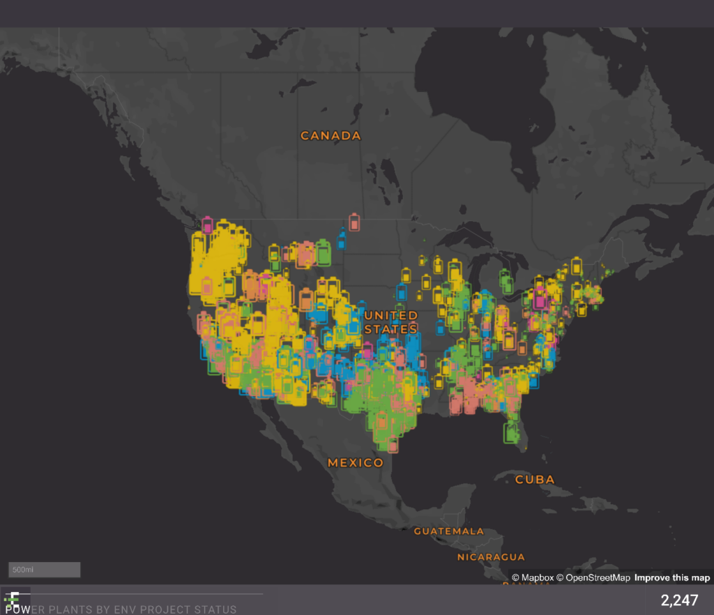 Figure 3: Map of all co-located energy storage plants that are planned and operational throughout the U.S. from PRISM Project Tracking offering