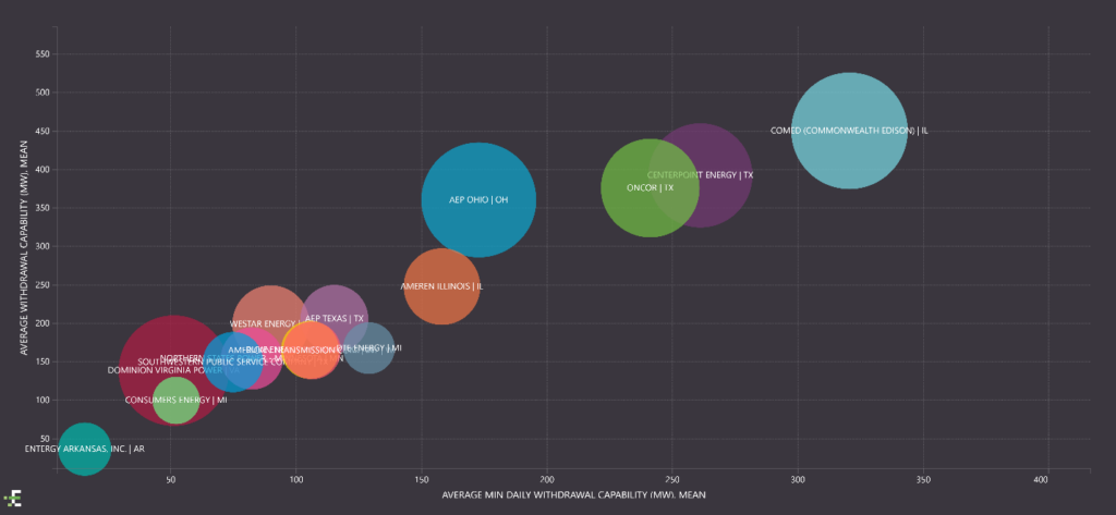 In assessing the average historical withdrawal capability at all buses across the utility territories captured in Figure 4, it’s clear that utilities such as ComEd, CenterPoint and Oncor have the highest withdrawal capability overall, as well as highest minimum withdrawal as well, addressing the fact that these capacities can change overtime. These areas are likely more reliable than others where the AWC may be high, but the minimum offtake is lower, representing potential fluctuations in power availability.