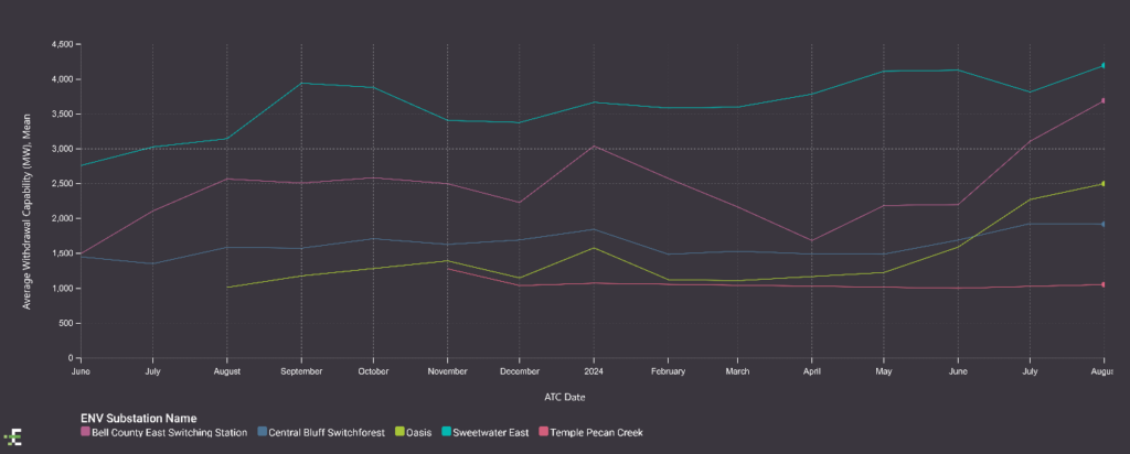 Within this analysis, we can identify buses located within 1 mile of co-located storage and renewable assets. This narrows the focus to five substations within the Oncor and CenterPoint territories that are near planned or operational co-located storage-solar or storage-wind plants. These substations also demonstrate an available withdrawal capacity exceeding 1,000 MW on average over the past year and a half, making them ideal candidates for reliable interconnection.