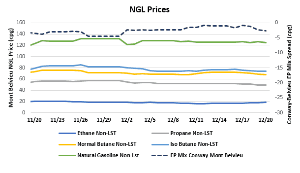 - The EIA reported a 2.54 MMbbl gain in propane/propylene stocks for week that ended Dec. 13. These inventories now stand at 90.96 MMbbl, which is 17.71 MMbbl higher than the same week in 2018 and 19.62 MMbbl higher than the same week in 2017.
