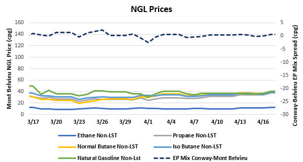 - Purity product pricing was up across the board last week. Ethane saw a gain of $0.014/gallon to $0.117, propane increased $0.055/gallon to $0.352, normal butane jumped $0.045/gallon to $0.381, isobutane gained $0.041/gallon to $0.368, and natural gasoline increased $0.009/gallon to $0.372.