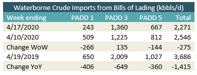 - The Energy Information Administration reported another very large inventory build last week, and still more builds are expected. According to the EIA, total US commercial crude oil stocks increased by 19.2 MMbbl the week that ended April 10, with Cushing accounting for 5.8 MMbbl of the build and PADD 3 making up another 10.3 MMbbl. Total gasoline stocks were up 4.9 MMbbl, of which blending components made up 3.9 MMbbl. Distillate inventories bulged 6.3 MMbbl as demand dropped by over 1 MMbbl/d week-on-week. Overall, total US commercial petroleum stocks were up 27.2 MMbbl/d compared to the prior reported week.