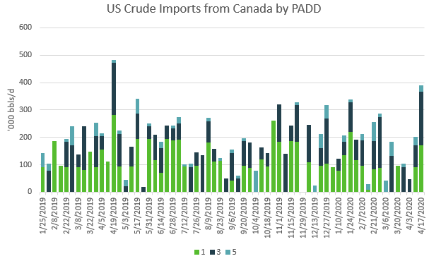 - Imports from Canada rose this week with 172,000 bbl/d imported to PADD 1, 194,000 bbl/d imported to PADD 3 and 24,000 bbl/d imported to PADD 5. This represented the highest Canadian imports since the week of April 19, 2019. Among these imports, Hebron and Hibernia were received by Phillips 66 Bayway in PADD 1 and Valero St. Charles, Valero Tule Lake and Phillips 66 Alliance in PADD 3. Synthetic crude was fed to Shell Martinez in PADD 5.