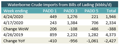 - US waterborne imports of crude oil fell last week, according to Enverus’ analysis of manifests from US Customs and Border Patrol. As of today, aggregated data from customs manifests suggested that overall waterborne imports fell by 388,000 bbl/d from the prior week. PADD 3 imports decreased by 108,000 bbl/d and PADD 5 imports decreased by 486,000 bbl/d. PADD 3 imports rose by 206,000 bbl/d. This represented the lowest overall level of imports since the week of Jan. 6, 2017.