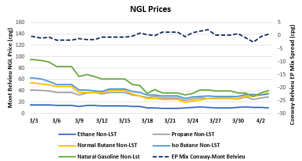 - For the most part, NGL prices saw an uptick last week as oil prices surged more than 30% and gas prices held relatively steady. Ethane gained $0.004/gallon to $0.106, propane increased $0.013/gallon to $0.272, normal butane gained $0.074/gallon to $0.312, and isobutane gained $0.036/gallon to $0.328. Natural gasoline was the only product to fall on the week, dropping $0.022/gallon to $0.357.