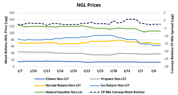 - Propane prices last week were supported by gains in crude and the EIA reporting a large inventory draw, while butane prices continue to be pressured lower with declines in gasoline blending demand.