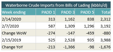 - US waterborne imports of crude oil fell last week according to Enverus’ analysis of manifests from US Customs and Border Patrol. As of this morning, aggregated data from customs manifests suggested that overall waterborne imports fell by more than 800,000 bbl/d from the prior week with decreases in PADDs 1, 3 and 5. PADD 5 accounted for more than half of the overall decrease with a drop of 459,000 bbl/d while PADD 1 fell by 274,000 bbl/d and PADD 3 fell by 147,000 bbl/d.