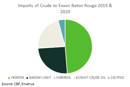- Last week’s fire at ExxonMobil’s Baton Rouge refinery forced the shutdown of three crude distillation units, according to Reuters. The refinery is relatively independent of waterborne imports, averaging only 22,500 bbl/d of imports in 2019. Much of these imports were crudes from the Canadian Atlantic Coast, while the refinery also took some Trinidadian, Kuwaiti and Iraqi crudes.