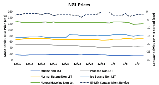 - The EIA reported an unseasonable build in propane/propylene stocks for week ending Jan. 3, with inventories gaining 699,000 bbl. Stocks now stand at 88.89 MMbbl, which is 20.15 MMbbl higher than the same week in 2019 and 27.20 MMbbl higher than the same week in 2018.