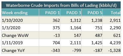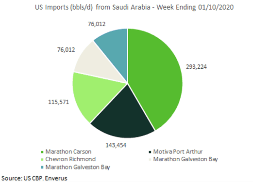 - US crude imports from Saudi Arabia hit 628,000 bbl/d for the week, the highest level of crude shipments from the kingdom since the week of Sept. 20. Marathon Petroleum’s Carson refinery received the highest portion of those Saudi imports, while Motiva Port Arthur and Chevron Richmond rounded out the Top Three. Chevron Richmond was the largest importer of Saudi crude in 2019, surpassing Saudi Aramco-owned Motiva Port Arthur.