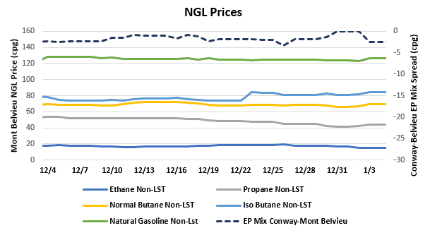 - The EIA reported a slight decrease in propane/propylene stocks for the week that ended Dec. 27, with inventories falling 212,000 bbl. Stocks now stand at 88.19 MMbbl, which is 17.53 MMbbl higher than the same week in 2018 and 20.21 MMbbl higher than the same week in 2017.
