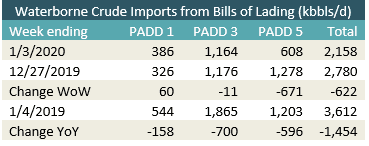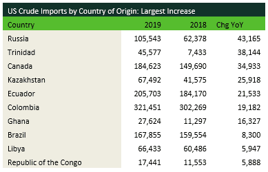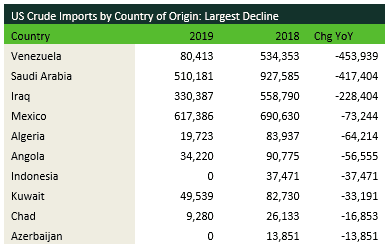- A massive drop was seen in average US waterborne crude imports during 2019, down by more than 1.2 MMbbl/d from 2018. The biggest decline came from sanctions on Venezuela, which reduced average imports from that country from more than 500,000 bbl/d to just over 80,000 bbl/d. Imports from Saudi Arabia fell by nearly half as the kingdom redirected its crude away from the well-supplied US market. Some countries saw increases, including Russia, Trinidad and Canada. Trinidad had its largest refinery shut in during 2018, so that country needed to find new export destinations for its barrels. Canada sent significantly more Atlantic Basin crude to the US, especially its Hibernia and Hebron grades.