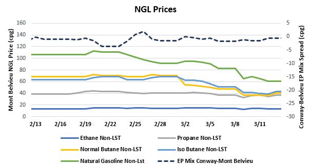- NGL prices saw declines week-over-week as crude oil prices continue to decline after Saudi Arabia flooded the market with crude and dropped its prices, combined with decreased demand related to the COVID-19. Ethane saw the smallest decline on the week, falling $0.009/gallon to $0.138. Propane fell $0.043/gallon to $0.354, normal butane fell $0.141/gallon to $0.375, isobutane fell $0.179/gallon to $0.407, and natural gasoline fell $0.270/gallon to $0.643.