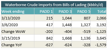 - US waterborne imports of crude oil fell last week, according to Enverus’ analysis of manifests from US Customs and Border Patrol. As of this morning, aggregated data from customs manifests suggested that overall waterborne imports decreased by 1.125 MMbbl/d compared with the prior week. PADD 1 imports dropped by 202,000 bbl/d, PADD 3 imports by 404,000 bbl/d, and PADD 5 imports by 519,000 bbl/d.