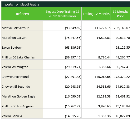 - With Saudi Arabia cutting oil prices and exports ramping up, we should start to see an increased level of imports from that country. Imports from Saudi Arabia to the US have fallen significantly since last year, down to an average of 483,000 bbl/d over the past 12 months versus 921,000 bbl/d for the 12 months before that. With Saudi crude coming back to the US, the list below shows the refineries that have seen the biggest drops in their Saudi imports.