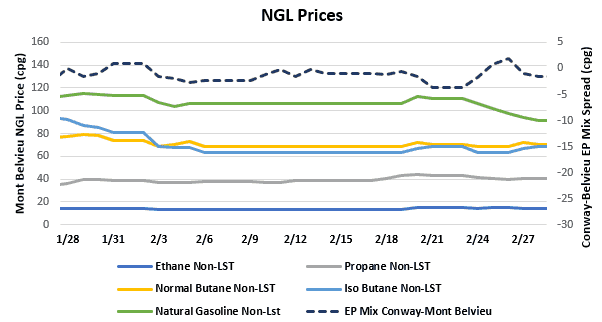 - The EIA reported a draw of propane/propylene stocks for week that ended Feb 21, showing inventories decreasing 688,000 bbl. Stocks now stand at 73.57 MMbbl, which is 20.16 MMbbl higher than the same week in 2019 and 19.29 MMbbl higher than the five-year average. The five-year average draw for next week’s report is 3.12 MMbbl, while the same time last year saw a draw of 2.04 MMbbl.