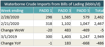 - US waterborne imports of crude oil fell for last week according to Enverus’ analysis of manifests from US Customs and Border Patrol. As of this morning, aggregated data from customs manifests suggested that overall waterborne imports fell by 5,000 bbl/d from the prior week. The decrease was driven by a 469,000 bbl/d drop at PADD 5, partially offset by a 483,000 bbl/d PADD 3 increase. PADD 1 imports fell by 20,000 bbl/d.