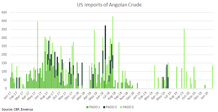 - The US imported crude from Angola for the second time this year as Par Pacific’s Kapolei refinery on Oahu imported a cargo of Cabinda aboard the Suezmax tanker Christina. Phillips 66’s Bayway refinery in New Jersey imported Angolan Hungo crude oil at the beginning of January. US imports of Angolan crude have declined significantly from 2017. Back then, PADD 1 was a consistent importer of Angolan crude, but imports to that region have declined significantly. The most consistent regional importer now is PADD 5.