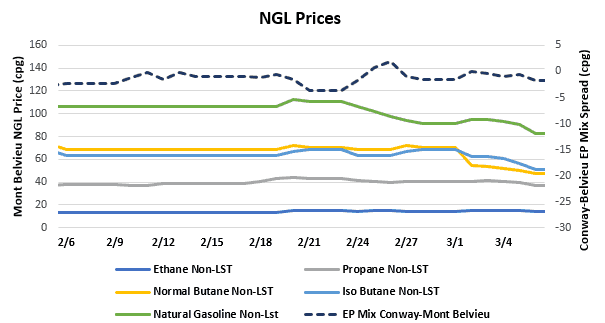 - The EIA reported a 3.62 MMbbl draw of propane/propylene stocks for week that ended Feb. 28. Stocks now stand at 69.95 MMbbl, which is 18.58 MMbbl higher than the same week in 2019 and 18.79 MMbbl higher than the five-year average. The five-year average draw for next week’s report is 1.26 MMbbl, while last year saw a draw of 1.21 MMbbl.