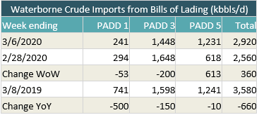 - US waterborne imports of crude oil rose last week, according to Enverus’ analysis of manifests from US Customs and Border Protection. As of this morning, aggregated data from customs manifests suggested that overall waterborne imports increased by 360,000 bbl/d on the week. PADD 5 imports rose by 613,000 bbl/d. PADD 1 fell by 53,000 bbl/d while PADD 3 fell by 200,000 bbl/d.