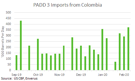 - PADD 3 imports of Colombian crude rose to their highest levels since September with cargoes of Castilla Blend being received by Citgo Corpus Christi, Enterprise’s Houston Ship Channel terminal and Semgroup’s Houston Ship Channel terminal. Citgo Lake Charles received a cargo of Vasconia.