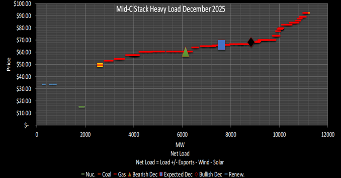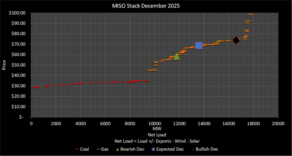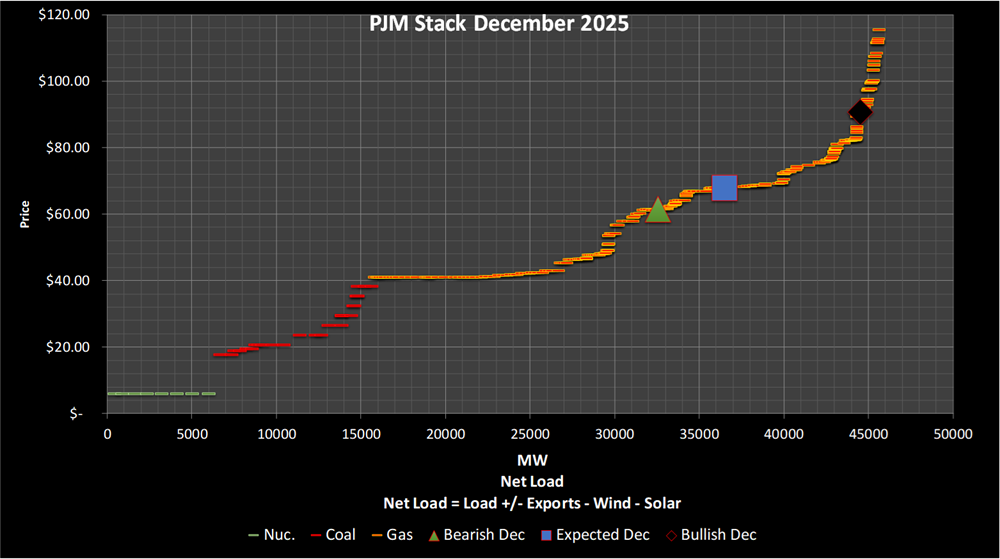 Our flow analysis suggests rising congestion at the AEP–Dominion Transfer Interface in December, driven by the 765 kV Belmont– Mount line outage (Dec. 1–19) and strong winter demand in Dominion, which encourages coal imports from West Virginia into southern Virginia—placing additional strain on the interface. When binding, it discounts WHUB.