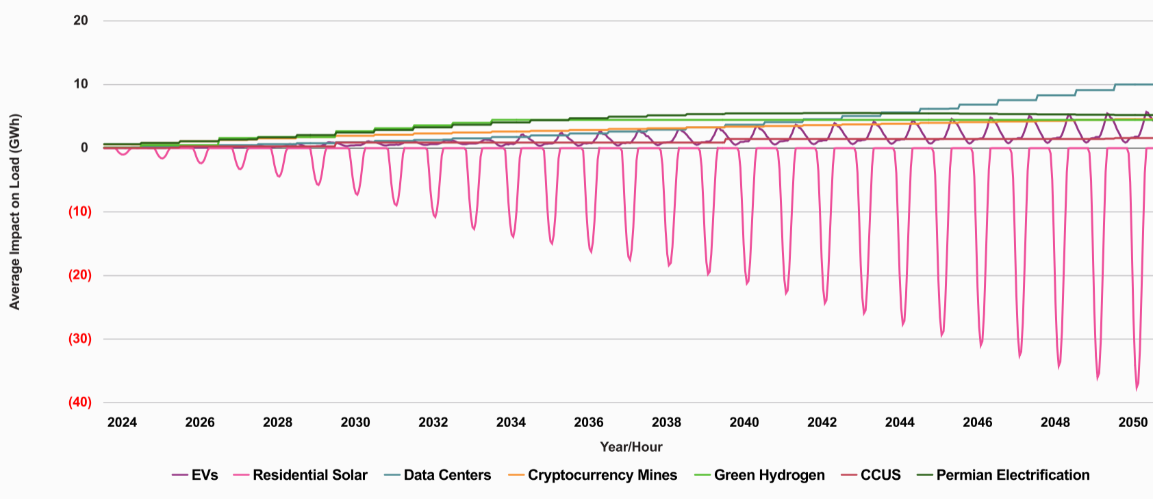 All aspects of ETR’s analysis on baseload growth are developed internally, based on their own proprietary models and sophisticated forecasting methods, of which all is made available to clients. They integrate traditional regression analyses, which account for key variables including population growth, temperature changes and seasonal trends, with contemporary factors that influence energy demands, such as advancements in technology and industry shifts. This ensures they stay ahead of emerging trends, not just relying on past data. Critical sectors including data centers, cryptocurrency and innovations in green hydrogen and carbon capture are reshaping energy demands. ETR pays close attention to developments, including the electrification of oil and gas operations in the Permian Basin and the balancing role of residential solar energy, providing depth to their strategic analysis necessary for maneuvering through the evolving energy landscape.