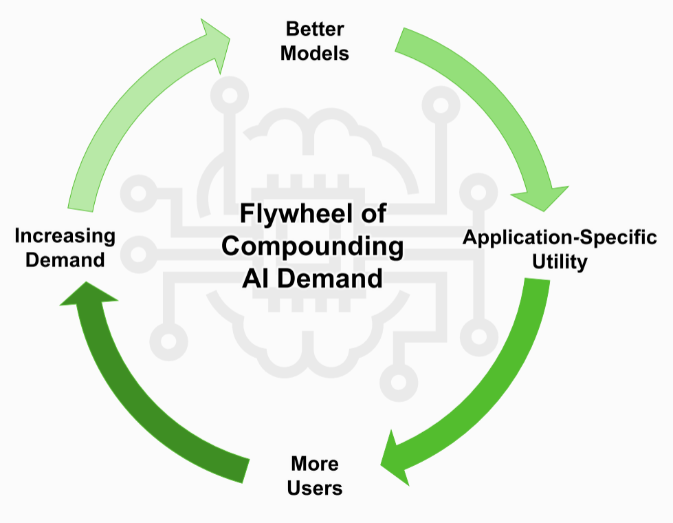 As the demand for AI increases, it creates a self-sustaining momentum like a flywheel, driven by the creation of better versions of models, such as the sophisticated Chat-GPT. With each new version, the applications become more precise and the use cases, covering both the retail and industrial realms, become clearer. This pursuit of specialized usefulness and the potential for making money leads to a perfect match between products and market demand, which sparks a rise in the number of users. When companies see that their products are hitting the mark in the market, they’re more likely to invest more money. This investment boosts the demand for even better and newer models, keeping the wheel of innovation and practical use turning.