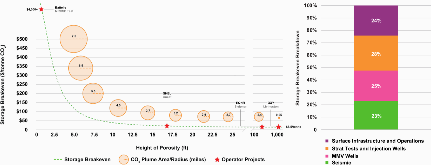Note | carbon storage break evens are reported in $/tonne CO2 for 1 mtpa injection at a 7,000-foot depth over a 25-year injection life using a 10% discount rate. Height of porosity is defined by reservoir thickness multiplied by porosity.